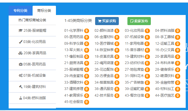 3.您也可以直接進入專利商城或者商標商城,直接在商城里通過關(guān)鍵字搜索,或者通過類別查找,亦或者直接瀏覽平臺推薦,找到合適自己的專利商標;